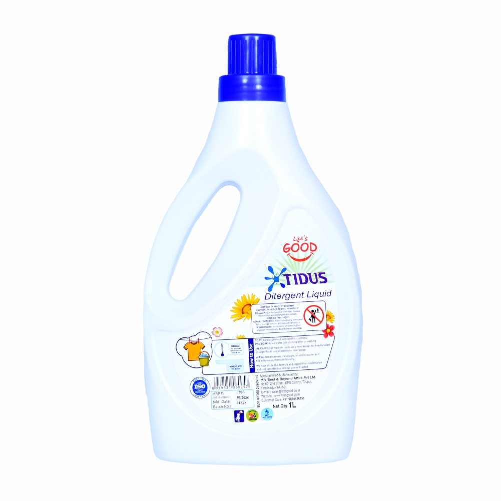 Gentle on Fabrics: Tidus-Liquid Detergent can be gentler on delicate fabrics compared to some powdered detergents that may contain bleach.